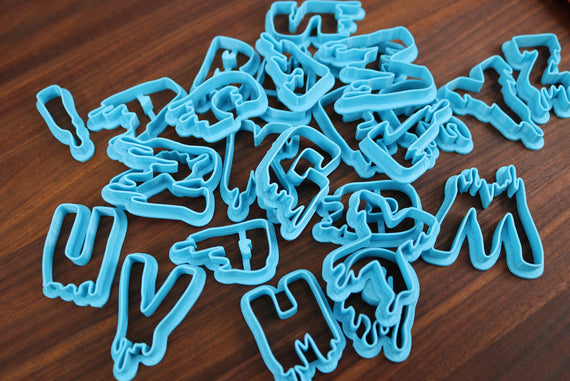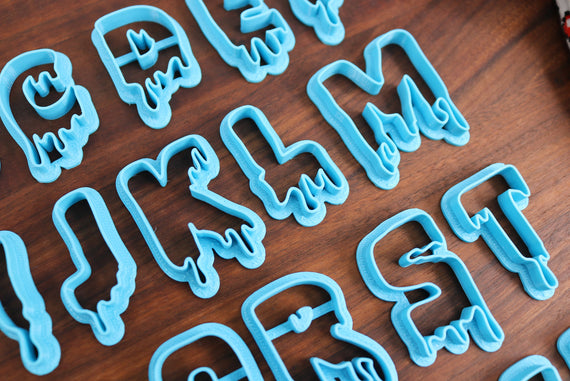 These fonts will be produced mirrored, so that when cutting the cookies normally, the letters will be the right way around. This set photographed was made special to show off the font in a readable way.