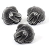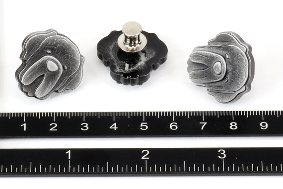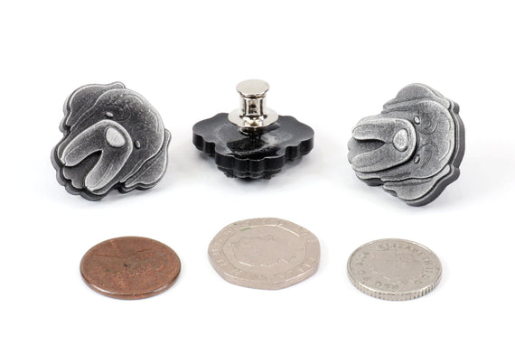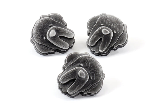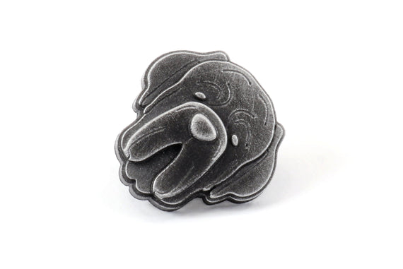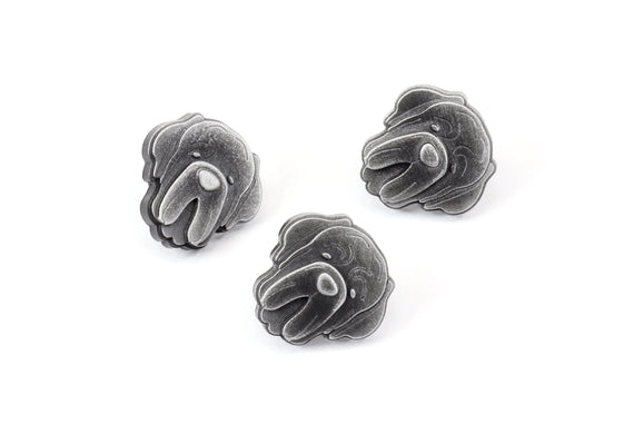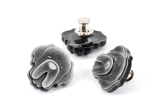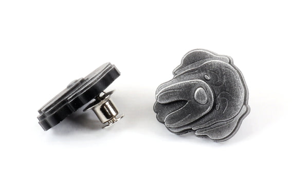 Each of our pieces is hand crafted with quality and care as our main priority. They start out as hand sculpted models that are then molded and cast with a special crystal resin and metal powder mix. This cast is then cleaned and aged using a method that brings out the design out to a shiny finish and leaves the piece with an antiqued feel. Each one is cleaned and secured to a hypoallergenic pin using super strong adhesive, leaving the finish piece lightweight and durable!