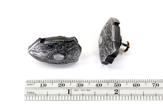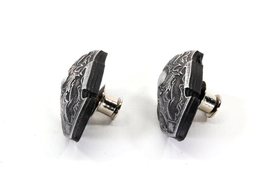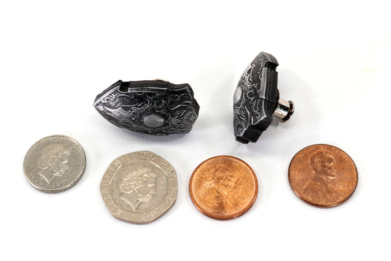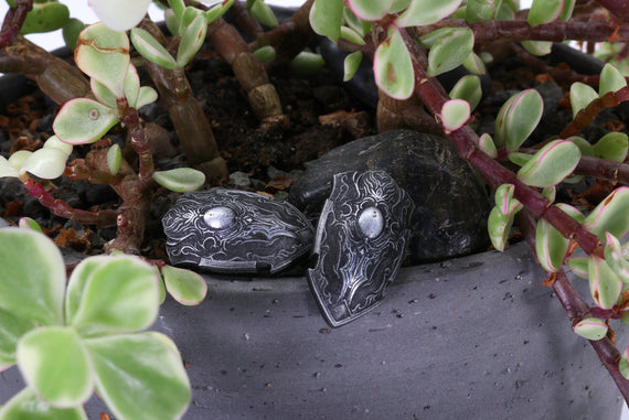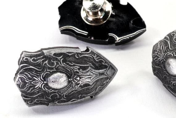 Each of our collectible pins is hand crafted with quality and care as our main priority. They start out as hand sculpted models that are then molded and cast with a special crystal resin and metal powder mix. This cast is then cleaned and aged using a method that brings out the design out to a shiny finish and leaves the piece with an antiqued feel. Each one is cleaned and secured to hypoallergenic pin using super strong adhesive, leaving the finish piece lightweight and durable!