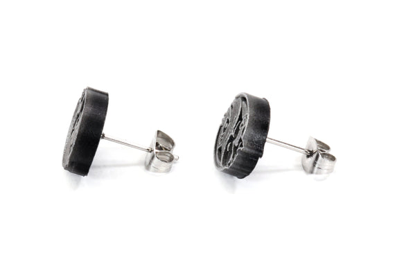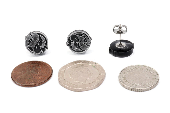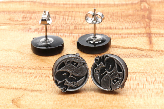 Each of our earrings is hand crafted with quality and care as our main priority. They start out as hand sculpted models that are then molded and cast with a special crystal resin and metal powder mix. This cast is then cleaned and aged using a method that brings out the design out to a shiny finish and leaves the piece with an antiqued feel. Each one is cleaned and secured to hypoallergenic stainless steel studs using super strong adhesive, leaving the finish piece lightweight and durable!