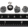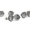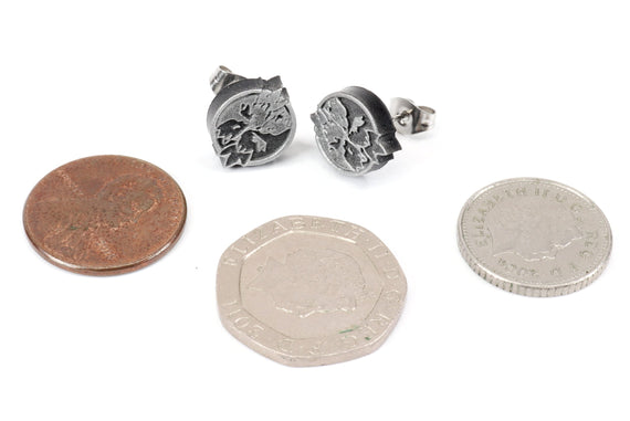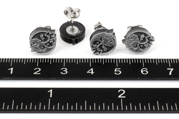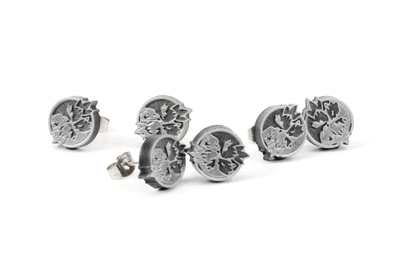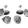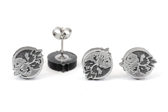 Each of our earrings is hand crafted with quality and care as our main priority. They start out as hand sculpted models that are then molded and cast with a special crystal resin and metal powder mix. This cast is then cleaned and aged using a method that brings the design out to a shiny finish and leaves the piece with an antiqued feel. Each one is cleaned and secured to hypoallergenic stainless steel studs using super strong adhesive, leaving the finished piece lightweight and durable!