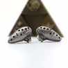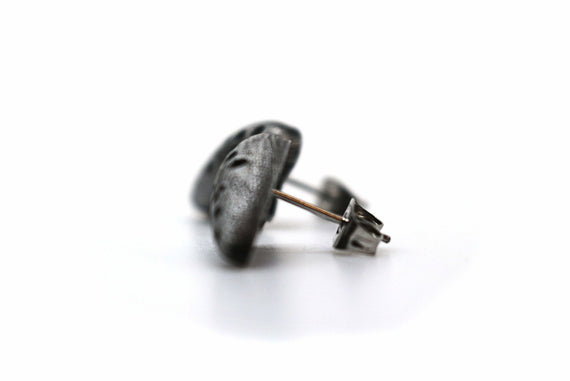 Each of our earrings is hand crafted with quality and care as our main priority. They start out as hand sculpted models that are then molded and cast with a special crystal resin and metal powder mix. This cast is then cleaned and aged using a method that brings out the design out to a shiny finish and leaves the piece with an antiqued feel. Each one is cleaned and secured to hypoallergenic stainless steel studs using super strong adhesive, leaving the finish piece lightweight and durable!