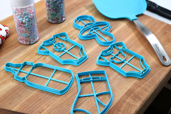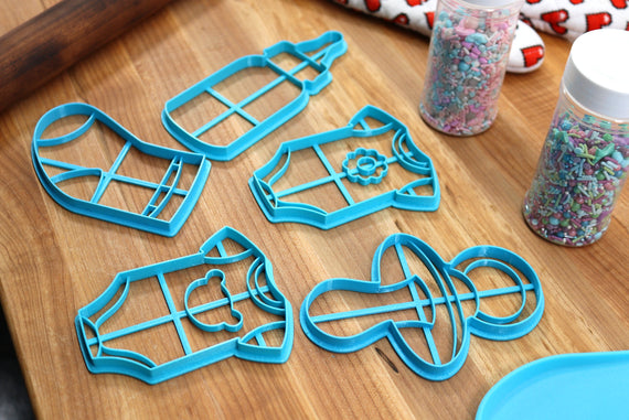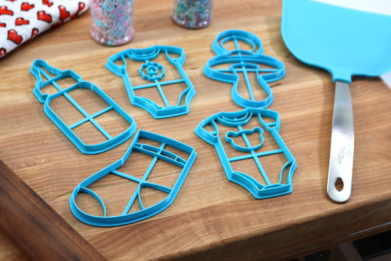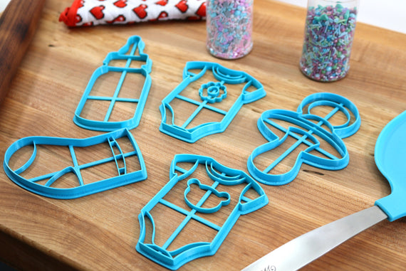 Baby Shower Cookie Cutters - Infant Bottle, Pacifier, Infant Sock, Flower Onsie, Bear Onesie