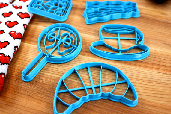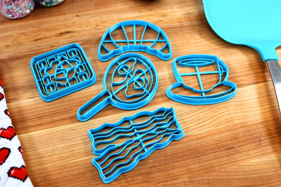 Breakfast Food Cookie Cutters - Fried Egg, Coffee, Croissant, Buttered Waffle, Bacon Strip