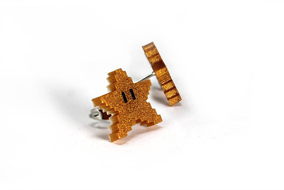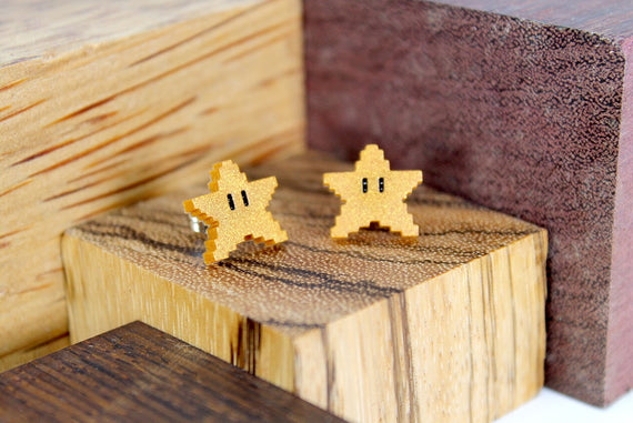 Power Stars, Mario's secret weapon for running his way through the mushroom kingdom! The Power Star gives him a burst of speed and strength that lets him destroy anything he touches. Now you too can sweep through the levels of life with a beautiful gold 8bit Power Star.