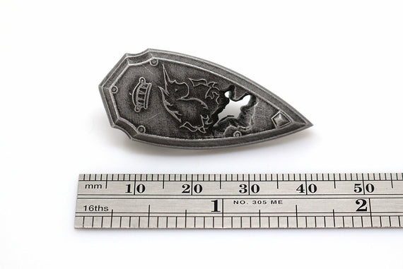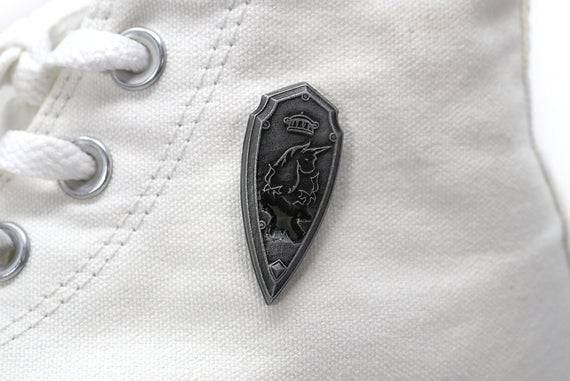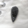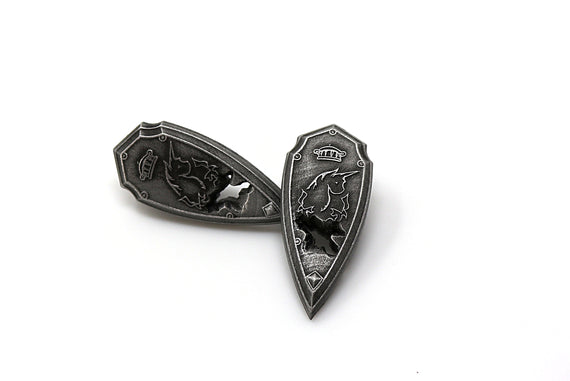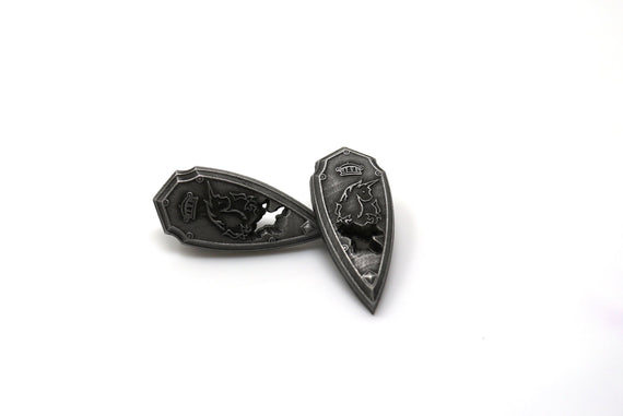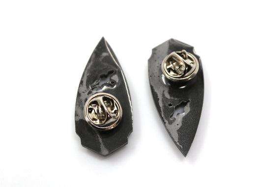 Each of our collectible pins is hand crafted with quality and care as our main priority. They start out as hand sculpted models that are then molded and cast with a special crystal resin and metal powder mix. This cast is then cleaned and aged using a method that brings out the design out to a shiny finish and leaves the piece with an antiqued feel. Each one is cleaned and secured to hypoallergenic pin using super strong adhesive, leaving the finish piece lightweight and durable!