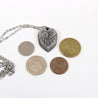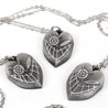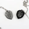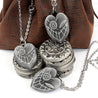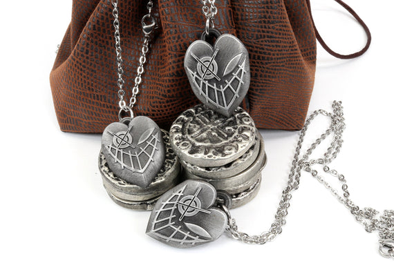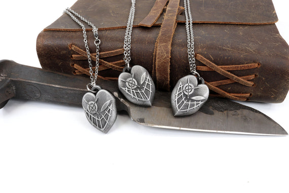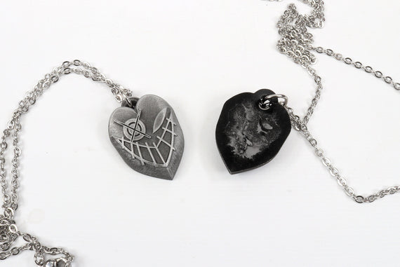 Each of our pieces is hand crafted with quality and care as our main priority. They start out as hand sculpted models that are then molded and cast with a special crystal resin and metal powder mix. This cast is then cleaned and aged using a method that brings out the design out to a shiny finish and leaves the piece with an antiqued feel. Each one is cleaned and secured to a hypoallergenic necklace using super strong adhesive, leaving the finish piece lightweight and durable!