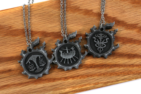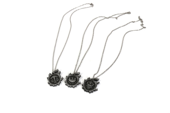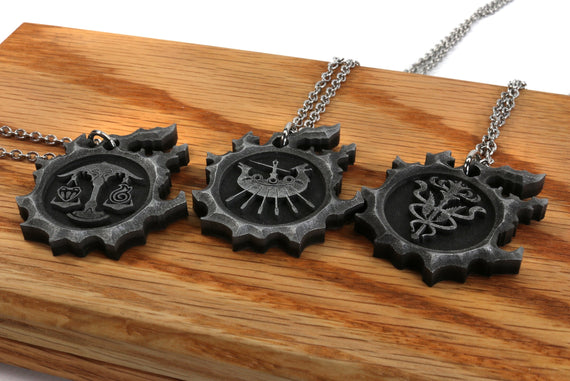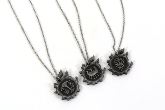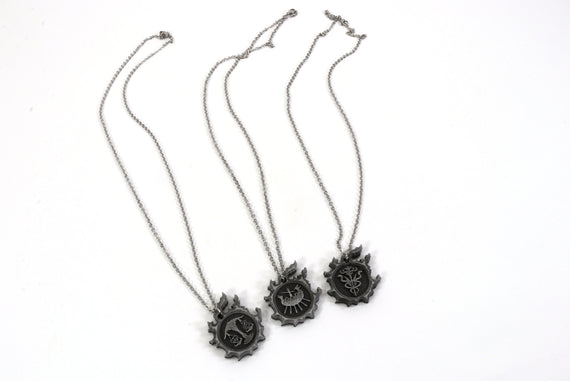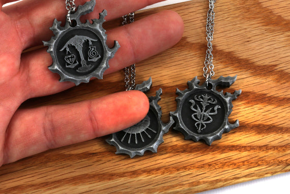 Each of our keychains and necklaces are hand crafted with quality and care as our main priority. They start out as hand sculpted models that are then molded and cast with a special crystal resin and metal powder mix. This cast is then cleaned and aged using a method that brings out the design out to a shiny finish and leaves the piece with an antiqued feel. Each one is cleaned and secured to a hypoallergenic necklace or key chain using super strong adhesive, leaving the finish piece lightweight and durable!
