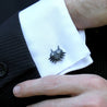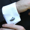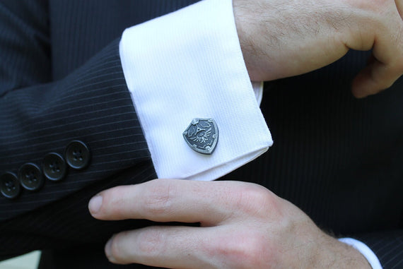 Each of our cufflinks is hand crafted with quality and care as our main priority. They start out as hand sculpted models then molded and cast with a special crystal resin and metal powder mix. This cast is then cleaned and aged using a method that brings out the design out to a shiny finish and leaves the piece with an antiqued feel. Each one is cleaned and secured to hypoallergenic stainless steel cufflinks using super strong adhesive, leaving the finished piece lightweight and durable!